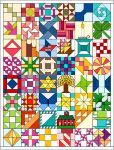This block looks complicated but if you break it down into units, it’s fairly easy. It’s also a good way to use up your half square triangles. I am attaching the pattern from EQ8. Block #4 Grape Basket, April
