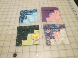 For the handles and top, I started off with sewing one strip to each triangle, press and repeat. Then sew to the larger triangle, pressing afterwards. Now, sew that unit together to the bottom and you’re done! Trim to 6.5 inches.
