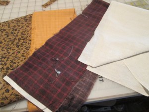 This is a very easy block and is fun to make. These are the fabrics that I chose, all from scraps. You will need 3 focus fabrics and a background.