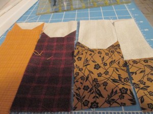 For the ears, you will need to cut two 1 inch squares per cat, a total of 6 squares. Place them at the bottom of your background fabric and fold over and sew.