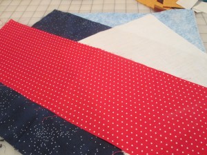 For the bottom part of the flag, continue to cut at one-half inch by 2.5 inches. You will need 2 of each of color. Starting with the white sew to the bottom of the flag. That will give you 4 stripes. Once that is done, square down to 2.5 inches.