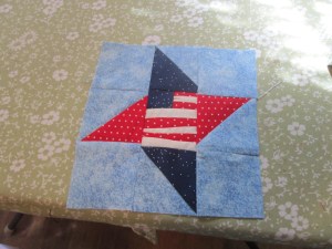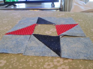 Sew the block together just like a Friendship Star. You will need four 2.5 inch squares for the outside. You will also need two 3 inch squares cut on the diagonal. Using the red and dark blue, cut those on the diagonal and sew to the light blue background fabric.