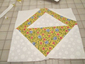 Sew the block together just like a Friendship Star. You will need four 2.5 inch squares for the outside. You will also need two 3 inch squares cut on the diagonal. Using the red and dark blue, cut those on the diagonal and sew to the light blue background fabric.