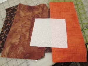 You need to cut out from the dark and background, four 2-inch squares. Also, you will need to cut two 2 3/8 inches and cut once on the diagonal.