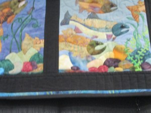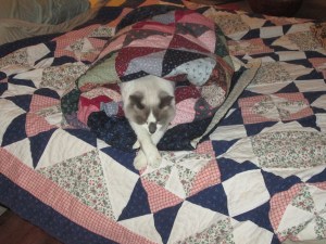 But first, this picture!  This is my sister’s cat, Spike in a quilt burrito on top of another quilt.  That is one of the first quilts that I made many years ago!  Isn’t he a sweetie!!